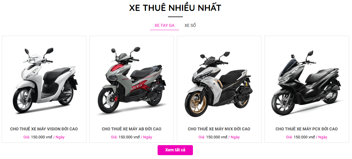 Các dòng xe chính : Honda Vision , Airblade, Vario, SHi 150, SHmode , Janus, Lead, Vespa, Nouvo 4 5 6 , Liberty , Exciter, Raider, Wave, Sirius